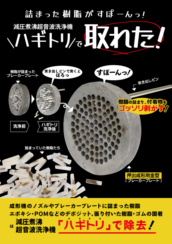 成形機のノズルやブレーカープレートに詰まった樹脂・エポキシ・POM・デポジットの除去なら、減圧煮沸超音波洗浄機「ハギトリ」におまかせ!