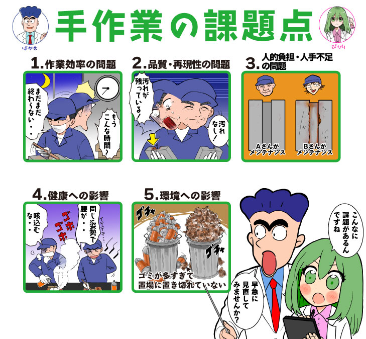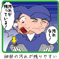誰でもできない 汚れの付着箇所や固着状態、除去方法を見極めるには経験が必要で、若手への技術継承が進まない要因にもなっています。