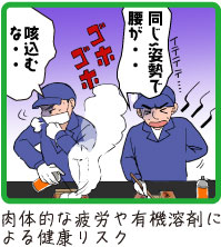 有機溶剤による健康リスク 洗浄用パーツクリーナーや溶剤の中には、有害な揮発性物質を含み、吸引によるめまい・頭痛・呼吸器障害、皮膚のかぶれ・炎症などを引き起こす恐れがあります。